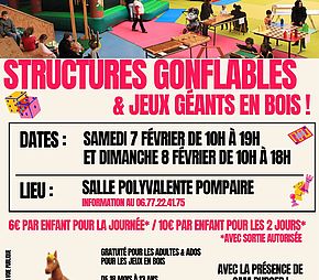 L’APE Louis Canis organise un week-end 100% structures gonflables et jeux géants en bois en collaboration avec Loisir et Partage 79, le week-end du 7 et 8 février 2026 à la salle polyvalente de Pompaire !